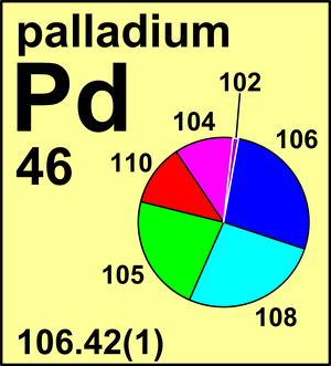 In 1969, the Commission recommended the standard atomic weight of Pd to be Ar(Pd) = 106.4(1) which gave palladium the least precisely tabulated atomic weight at that time. A decade later, using new mass-spectrometric measurements and evidence of lack of significant natural variations, the Commission recommended Ar = 106.42(1).