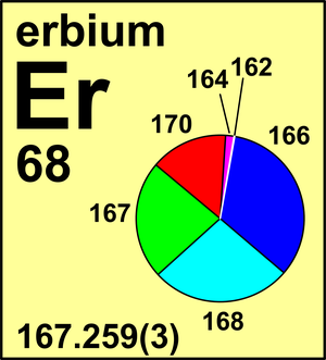 In 1969, the Commission assessed Ar(Er) = 167.26(3). The atomic weight and uncertainty of erbium were changed to their current values in 1999 as a result of new mass-spectrometric measurements. The "g" notation arises from the presence of naturally occurring fission products found in fossil reactors at Gabon, south-west Africa.