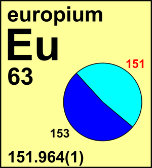 In 1961, the Commission recommended the atomic weight of europium to be Ar(Eu) = 151.96 based on recent mass-spectrometric determinations. Owing to the fact that europium has only two stable isotopes, in 1969, the standard atomic weight was assessed as Ar(Eu) = 151.96(1). Since that time, several another confirmatory isotopic composition measurements have become available and in 1995 the Commission recommended Ar = 151.964(1).