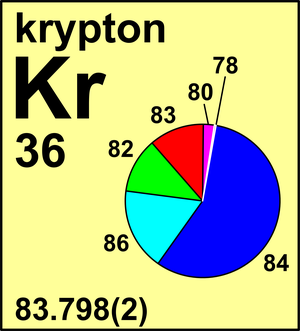 The atomic weight of krypton is based on analyses of krypton separated from air. In its 1961 report, the Commission recommended Ar(Kr) = 83.80 based on the isotope-abundance measurements by Nier. The standard atomic weight and uncertainty of krypton were changed to their current values in 2001 as a result of new mass-spectrometric measurements.