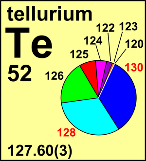 123Te, 128Te, and 130Te are radioactive; the minor isotope 123Te has a long half-life of 1.3(4)×1013 a and transforms into 123Sb without significantly affecting either element's atomic weight even over geological time. The major isotopes 128Te and 130Te have long half-lives of approximately 1024 a and 1021 a, respectively. These isotopes suffer double β– decay and are responsible for detectable xenon isotopic anomalies in old Te-bearing minerals.